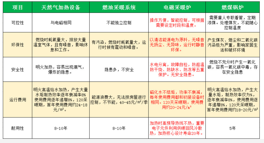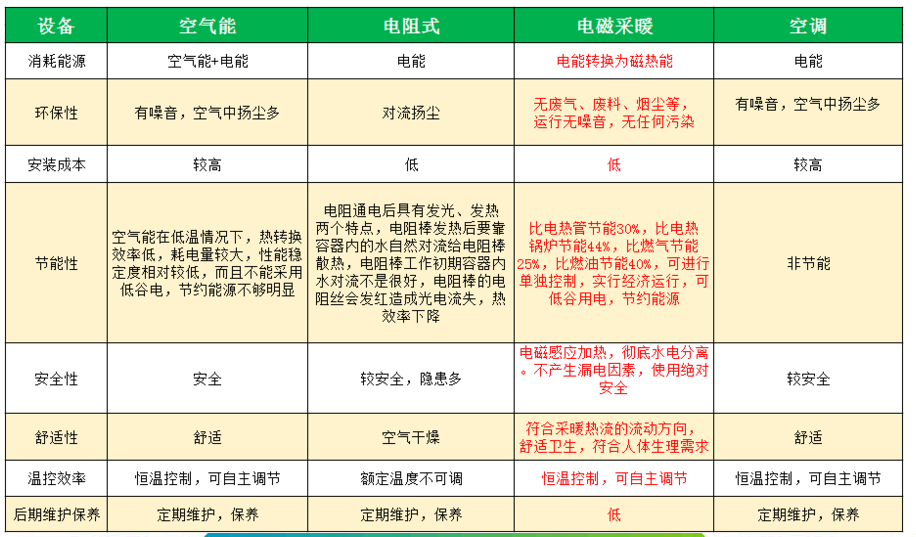 隨著天氣的漸冷冬季的到來(lái),一些北方寒冷的城市人們需要取暖來(lái)維持舒適溫度,進(jìn)而市場(chǎng)上出現(xiàn)各式各樣的取暖方式,采用電磁采暖器省電,安全,舒適,真正達(dá)到意義上的水電分離,成為冬季采暖的最佳選擇。以下是匯熱科技出產(chǎn)的電磁采暖與其它采暖的對(duì)比: